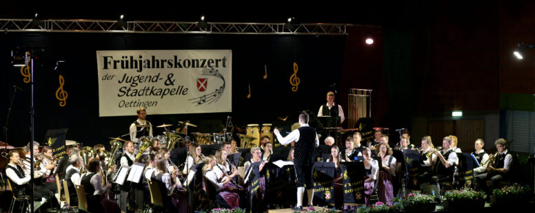 Jugend- und Stadtkapelle Oettingen überzeugt mit vielseitigem Programm unter neuer Leitung Nach einjähriger Pause veranstaltete die Oettinger Jugend- und Stadtkapelle wieder ihr traditionelles Frühjahrskonzert in der vollbesetzten Dreifachturnhalle in Oettingen. Die Jugendkapelle spielte erstmals unter der Leitung von Ute Fuchs und Steffen Müller und die Stadtkapelle unter der Leitung von Daniel Stimpfle. Die Jugendkapelle eröffnete den Abend mit dem Stück