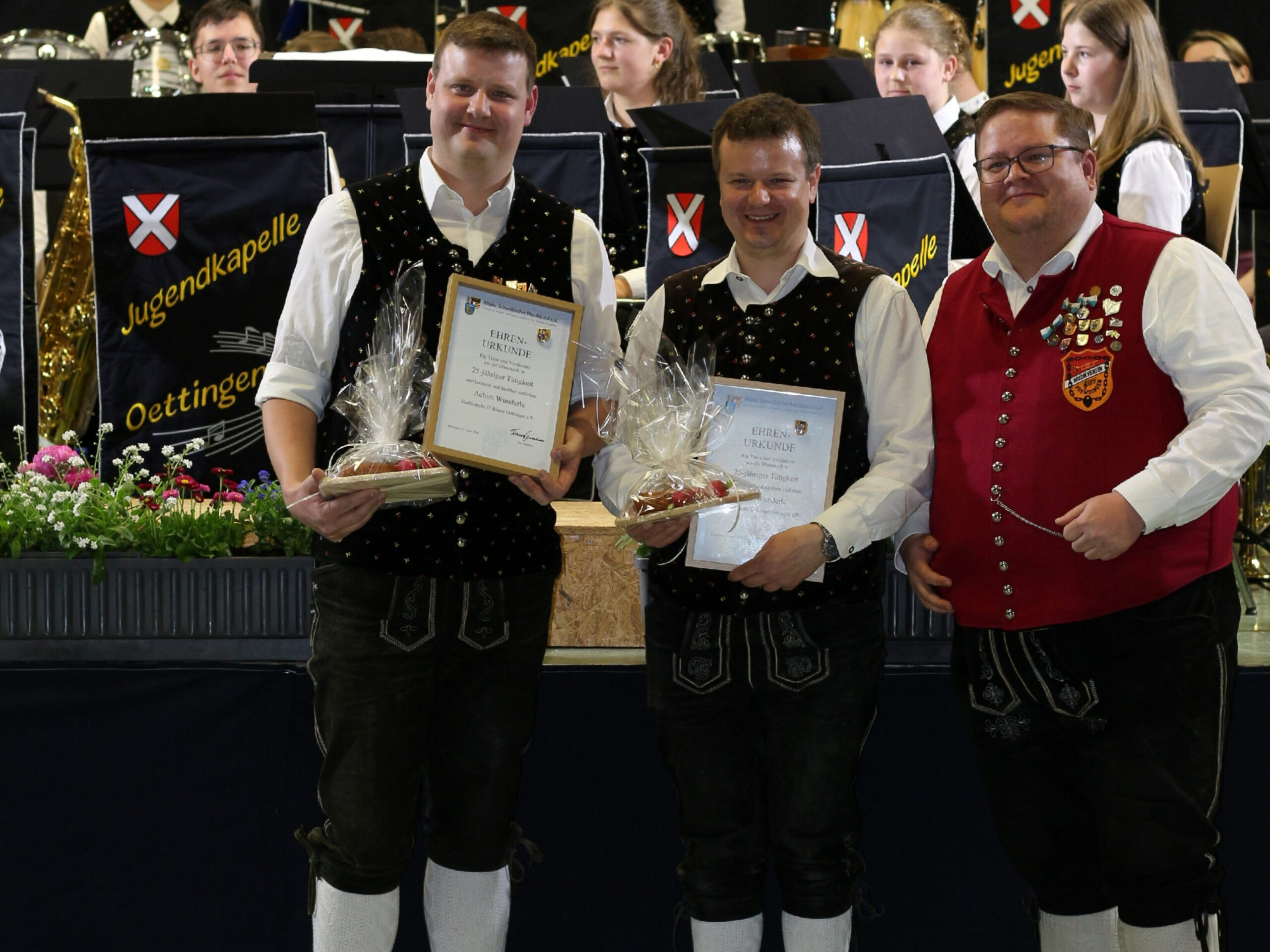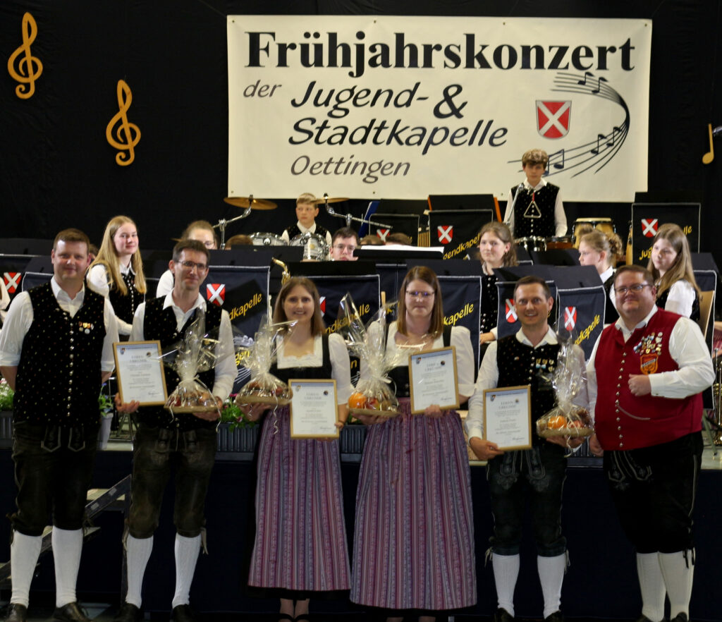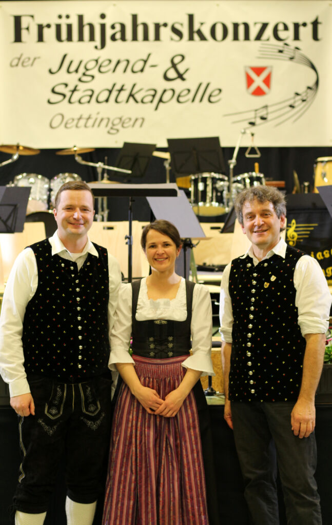 Im Rahmen des diesjährigen Frühjahrskonzertes wurden Ute Fuchs und Steffen Müller als neue Dirigenten der Jugendkapelle und Daniel Stimpfle als neuer Dirigent der Stadtkapelle vorgestellt. Ute Fuchs und Steffen Müller sind bereits seit vielen Jahren in der Stadtkapelle als Musiker tätig. Sie engagierten sich bereits mit viel Herzblut als Aushilfsdirigenten für beide Kapellen und eine erfolgreiche Jugendarbeit. Daniel Stimpfle war zuvor neun Jahre als Dirigent der Jugendkapelle Fremdingen aktiv. Nun übernimmt er nach Abschluss seiner Ausbildung zum staatlich anerkannten Dirigenten die Leitung der Stadtkapelle Oettingen. Die Vereinsführung wünscht allen dreien viel Freude und Erfolg bei der musikalischen Weiterentwicklung der beiden Kapellen und viele schöne musikalische und kameradschaftliche Momente.